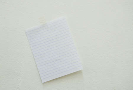 A white sheet of A4 paper hanging on a wall glued with a piece of paper tape on a wooden background.