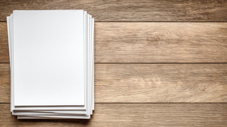 A neat stack of blank white paper sheets rests on a rustic wooden table. This image captures an appealing workspace setting, perfect for office use and creative projects.