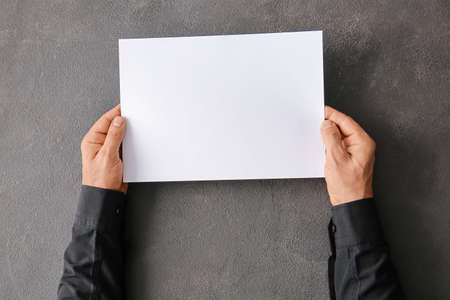 Male hands with blank paper sheet on dark background