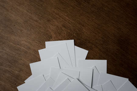 Top view of white business cards in pattern on dark wooden background, use for mock up branding identity