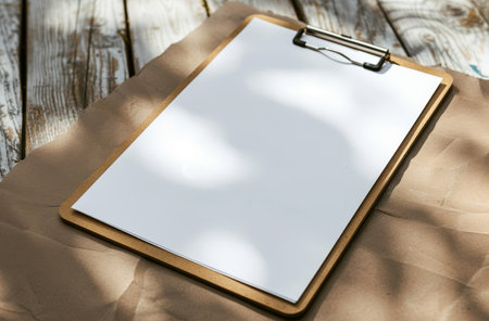 Clipboard on a wooden table with natural sunlight