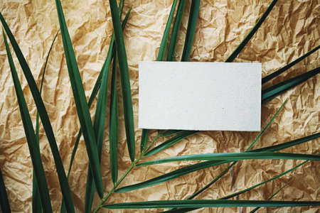 White business card flatlay on brown parchment paper background and green exotic leaf, luxury branding flat lay and brand identity design for mockup