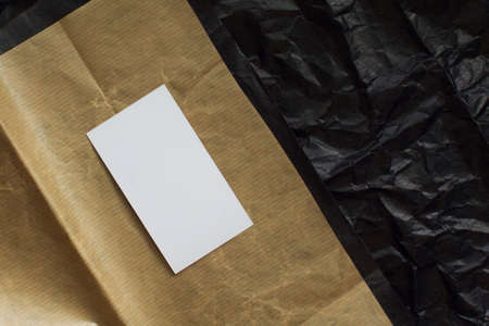 White business card flatlay on brown parchment paper background, luxury branding flat lay and brand identity design for mockup