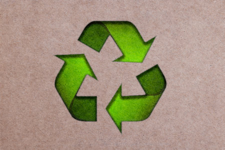 The three green arrows going in a triangle, international recycle symbol on Brown Cardboard. Paper or cardboard eco friendly