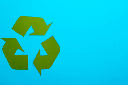 Recycle concept showing paper with the green recycle logo on a blue weathered background