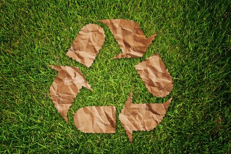 Recycling concept - recycling symbol made in cardboard with plastic, green grass in background
