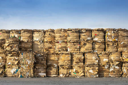 Dump pile of used shreded paper wrap and document against bales of compressed cardboard collected for recycling and reuse at industrial plant or factory. Sustainable materials and environment concept