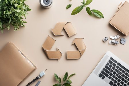 A neat workspace features a recycling symbol made of cardboard, surrounded by plants and office supplies.