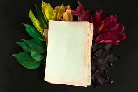 top view blank vintage rough paper with place for text and autumn multicolored leaves gradient frame flat lay on a black background