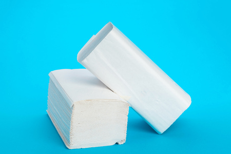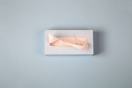 Picking facial napkin, tissue paper from the tissue box on blue background. Top view. Flu, illness, pandemic concept
