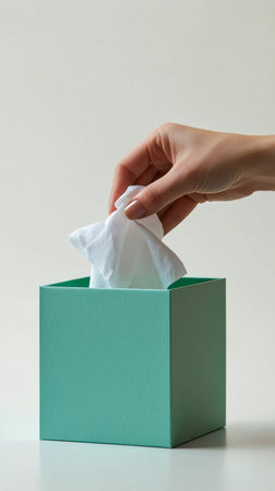 A hand is seen reaching into a simple green box designed to hold paper tissues, pulling out one tissue for use. The setting is minimalistic with a light background.