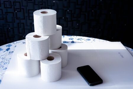Sold out. Panic, fear and world wide toilet paper crisis related to the outbreak of the COVID-19 coronavirus. A large stack of white paper roll packages, horizontal poster with dark background.