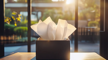 A white tissue box elegantly placed on a wooden table, surrounded by bright interior with sunlight streaming in. Perfect for themes of comfort and wellness.