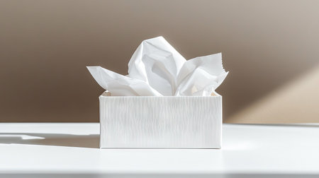 A wooden tissue box sits on a bright surface with tissues spilling out. Soft, natural light casts shadows across the scene, highlighting the textures of the wood and paper. A delicate floral element adds a touch of nature. The image is suitable for various commercial uses and presentations.