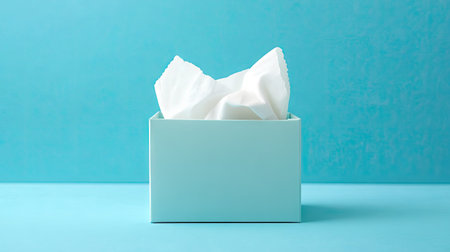 A light blue box filled with soft white tissues sits against a pastel blue background, embodying comfort and cleanliness, ideal for various settings such as homes and offices.