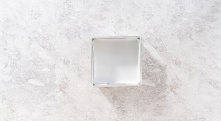 Flat lay. Lining square cheesecake pan with parchment paper sheet to prepare eggnog fudge.