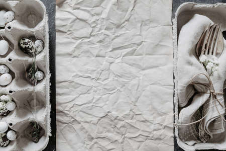 Easter table setting with napkin and egg box on the sides of black stone with piece of vintage paper
