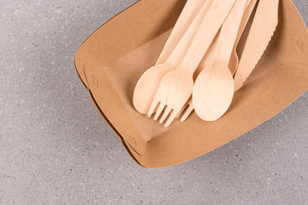 Eco food packaging concept. Paper utensils - paper food plate and wooden bamboo cutlery set over gray concrete background with copy space for text