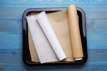 Rolls of parchment paper in baking pan on light blue wooden table, top view