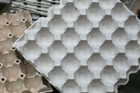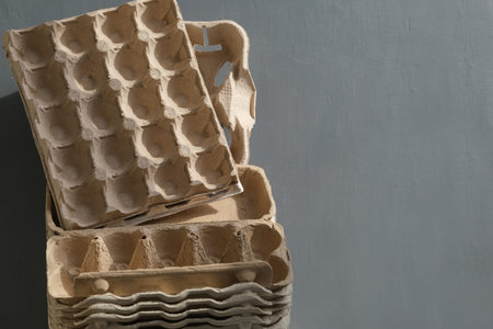 egg cardboards and empty egg carton boxes on a grey wall background, reusable packaging and recycling food package