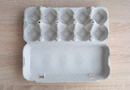 Cardboard egg box. Empty egg carton. Eggs box. Empty box of 10 eggs on a wooden table