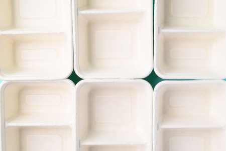 Refuse plastic whenever possible. Close up of white container lids in row on green background. Sustainable eco friendly food packaging and recycling concept