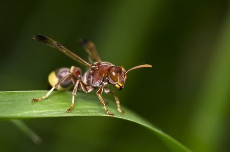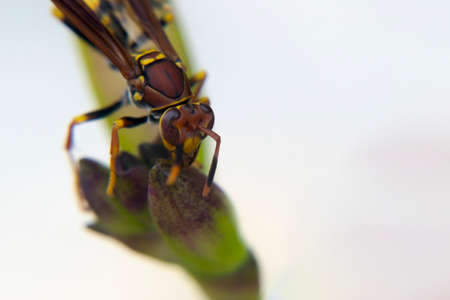 beautiful small Brown Paper Wasp sits on a green wall closeup stock photo