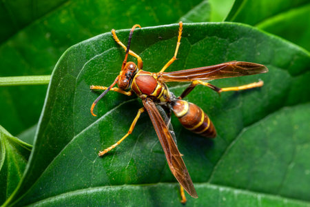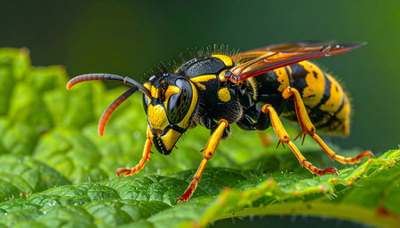 Wasp perched on green leaf, glossy exoskeleton highlighted, close macro.