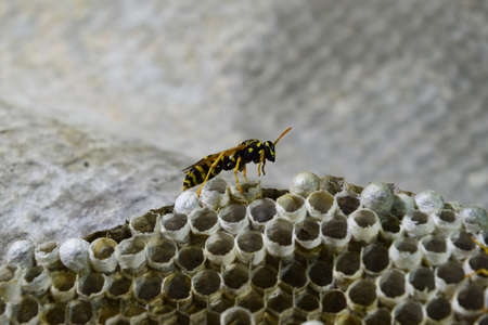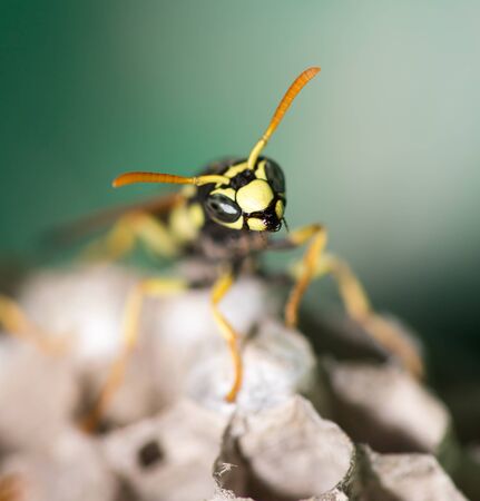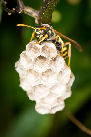 European Polistes galicus wasp hornet taking care of his nest and larvae