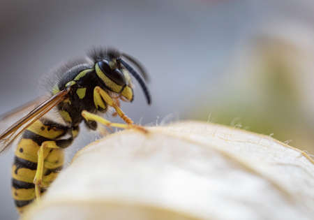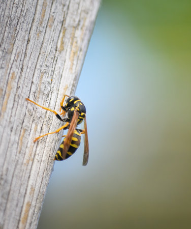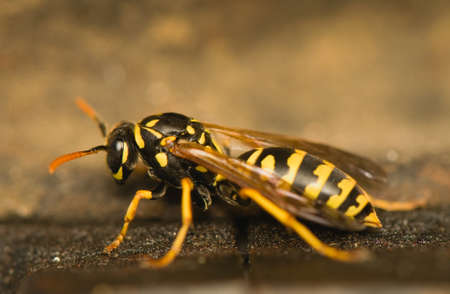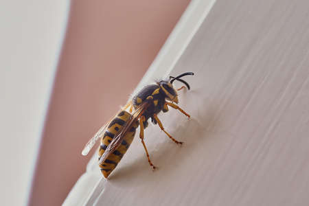 blurry effect on adult bright alive yellow black wasp sit on window glass. Macro of yellow black wasp on window