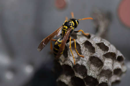 Wasp nest with wasps sitting on it. Wasps polist. The nest of a family of wasps which is taken a close-up.