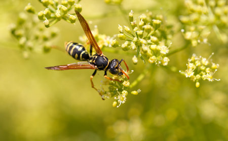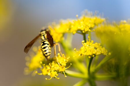 Close-up of a yellow and black striped wasp sitting on the flower of a wild fennel against a green background, with space for text