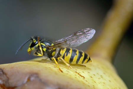 wasp on a watermelon close up on a grass background. A wasp macro.