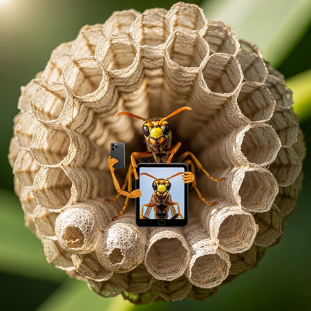 Macro shot of a wasp with detailed texture perched on its hexagonal nest structure, demonstrating the insects features and habitat.