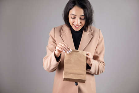 Hand holds craft eco pack on gray background, mock up. Delivery concept. High quality photo