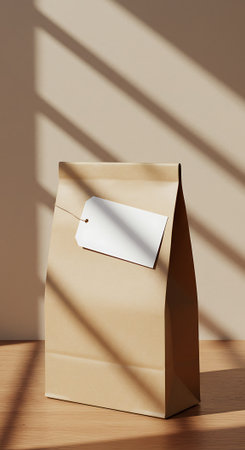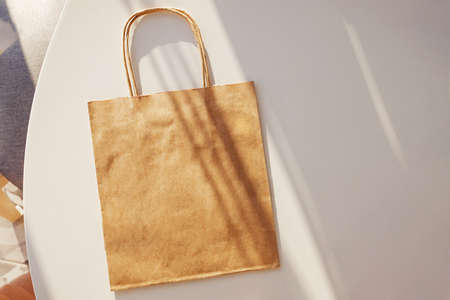Craft paper bag mock-up on the white table with hard shadows.