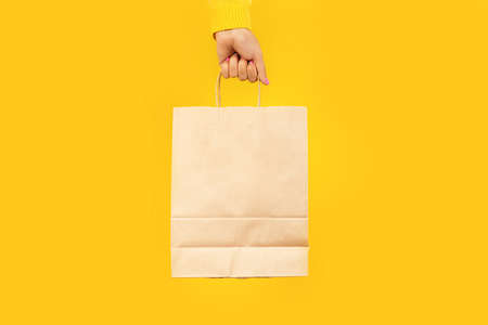 Woman hand holding paper shopping bag on yellow background. Shopping concept.