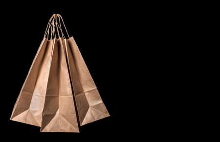 Three brown paper bags with cardboard handles on a black background. Copy space