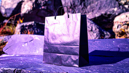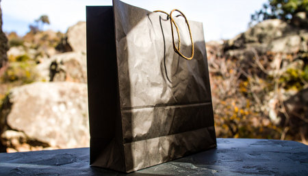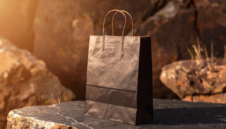 black kraft paper shopping bag with flat bottom and twisted handles, standing on dark textured stone surface, natural side light