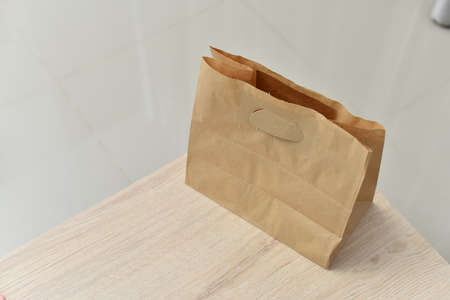 Paper bag on light wooden floor. Simple brown paper bag for lunch or meal. The layout for the design. Environmental ship packages.