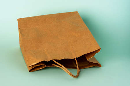eco-friendly paper bag with shopping handles on a turquoise background.