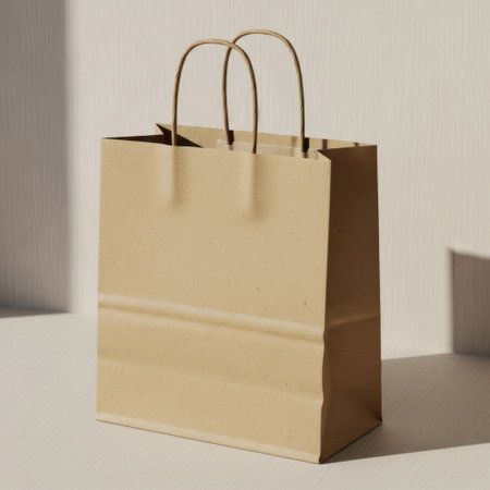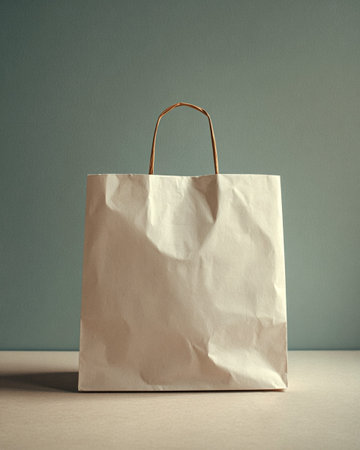 Plain paper shopping bag with twisted handles sits on a beige surface, against a soft blue wall, highlighting its simple and textured appearance