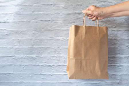 Hand holding paper bag on brick wall background. Paperboard bag in hand on vintage white brickwork wall. Makeup for donation or sponsorship concept