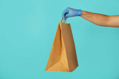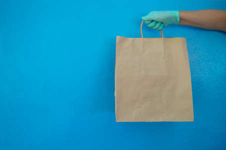 A mans hand in a protective rubber glove holds a paper shopping bag horizontally on a blue background. Food delivery during quarantine, donations. A helping hand. Close-up. Copy space.