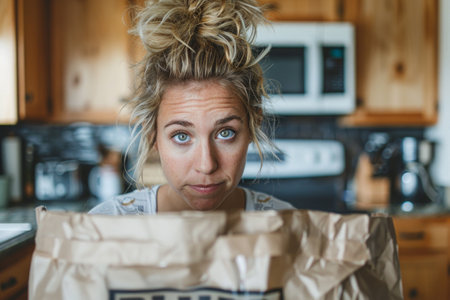 A woman with long hair stands in a cozy kitchen, holding a brown paper bag in her hands, anticipation evident on her face.