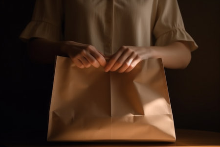 paper bag with products in the hands of a woman. female hold in hand brown paper bag with food products. Delivery service from shop or restaurant concept. Copy space advertising mock up. Generative AI