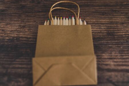 back to school stationery shopping concept with brand new coloured pencils in paper shopping pag on desk