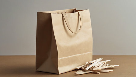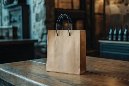 Craft paper bag with logo placed on a wooden table, representing small business, local production, or takeaway orders