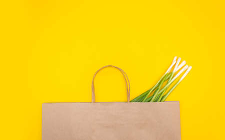 Paper eco bag with green onions on a yellow background