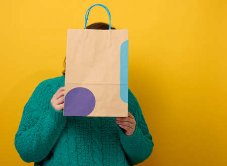 female holding in hand brown blank craft paper bag for takeaway on yellow background. Packaging template mock up. Delivery service concept